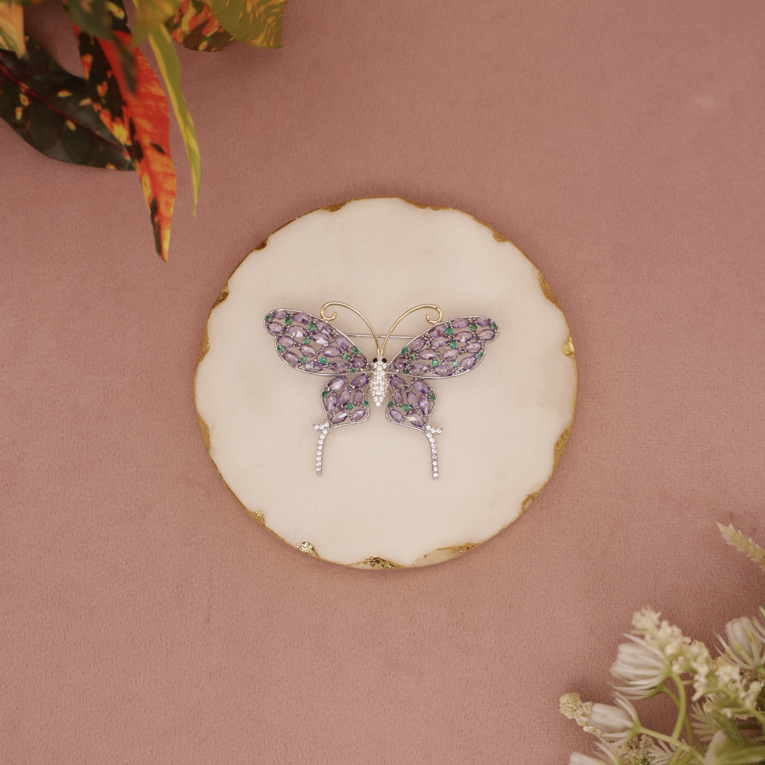 Butterfly-shaped jewelry piece with purple and green gemstones on a beige background
